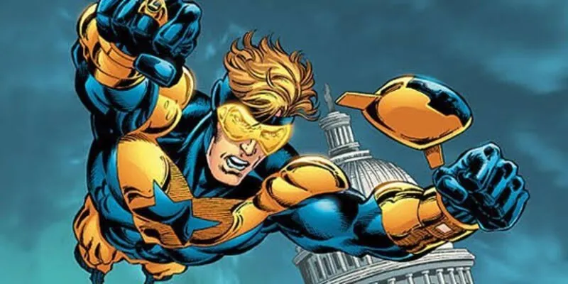 Contexto do personagem: Criado em 2005, o Gladiador Dourado (Booster Gold) é conhecido por suas falhas éticas e busca por reconhecimento fácil, características perfeitas para uma sátira.