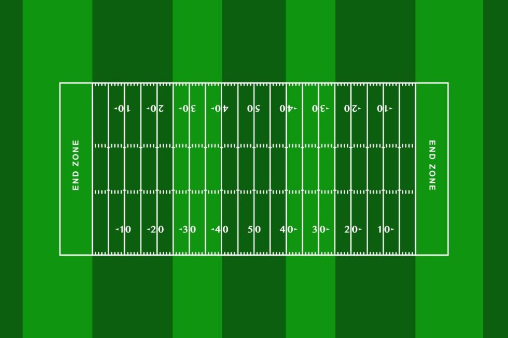 O campo tem 100 jardas de comprimento (cerca de 91,44 metros), dividido por linhas brancas que marcam as jardas. Nas extremidades, ficam as end zones, áreas que valem o touchdown (a maior pontuação do jogo). Cada time tem um quarterback, o líder do ataque, responsável por armar as jogadas e lançar a bola para os receivers (jogadores que recebem os passes).