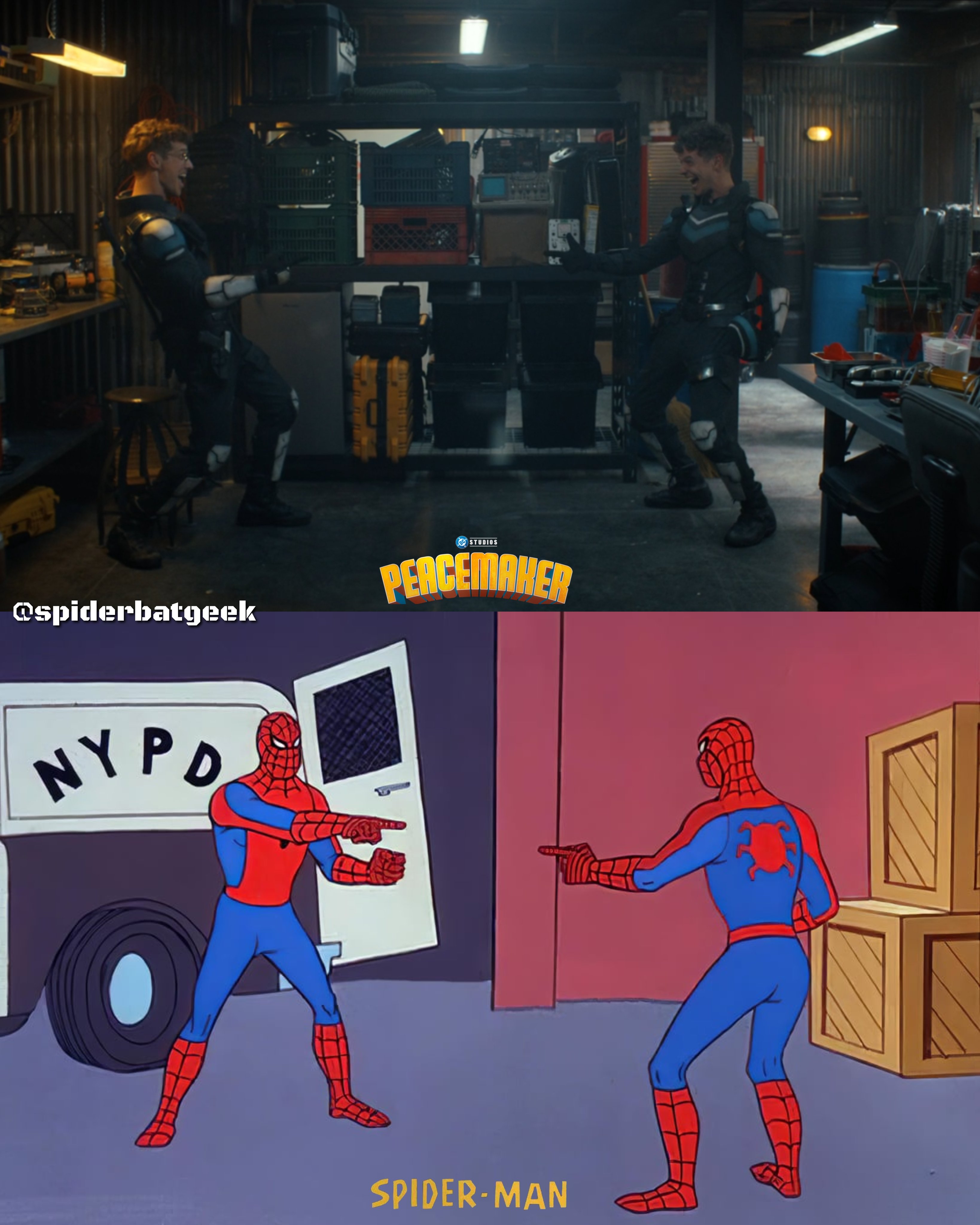 Contexto da cena: O Vigilante encontra versões alternativas de si mesmo em dimensão paralela e comenta: “Parece aquele meme do Homem-Aranha!”.