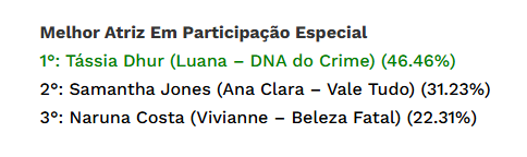 O processo de votação do Notíciasdetv.com ocorre em duas etapas: primeiro, o público, com apoio dos próprios artistas, escolhe os três finalistas de cada categoria; depois, um vencedor é definido. Na fase inicial, Tássia concorreu com nomes como Bruna Mascarenhas (Maníaco do Parque), Caroline Abras (Raul Seixas: Eu Sou), Georgette Fadel (Beleza Fatal), Fernanda Marques (Vale Tudo), Naruna Costa (Beleza Fatal), Nathália Falcão (Maníaco do Parque), Rhaisa Batista (Vale Tudo), Samantha Jones (Vale Tudo) e Talita Younan (Maníaco do Parque). Classificada para a final, a atriz maranhense venceu com ampla vantagem, somando 46,46% dos votos, seguida de Samantha Jones com 31,23% e Naruna Costa com 22,31%.