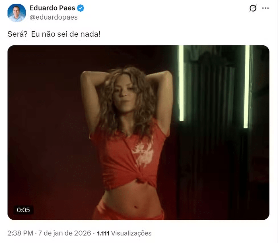 O prefeito do Rio de Janeiro, Eduardo Paes (PSD), voltou a provocar curiosidade nas redes ao publicar um vídeo de Shakira com a legenda: “Será? Eu não sei de nada!”. A postagem reacendeu rumores...